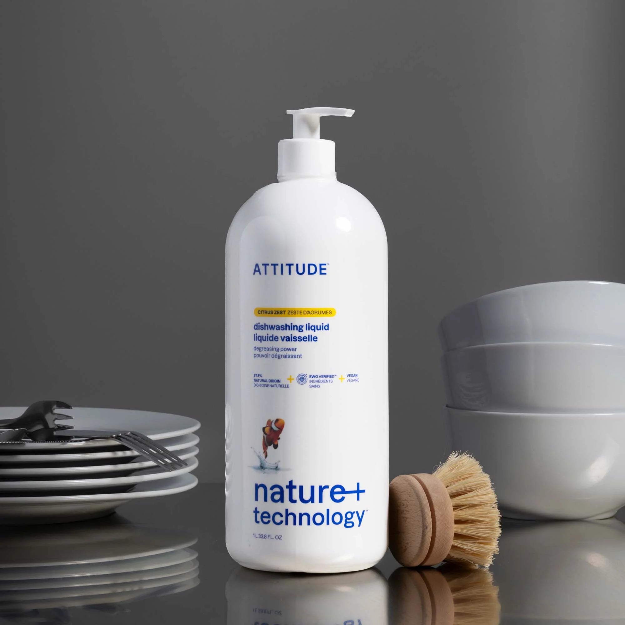 Infused with a crisp and refreshing aroma, ATTITUDE⢠dishwashing liquid â Citrus zest with foaming action eliminates grease and residue.