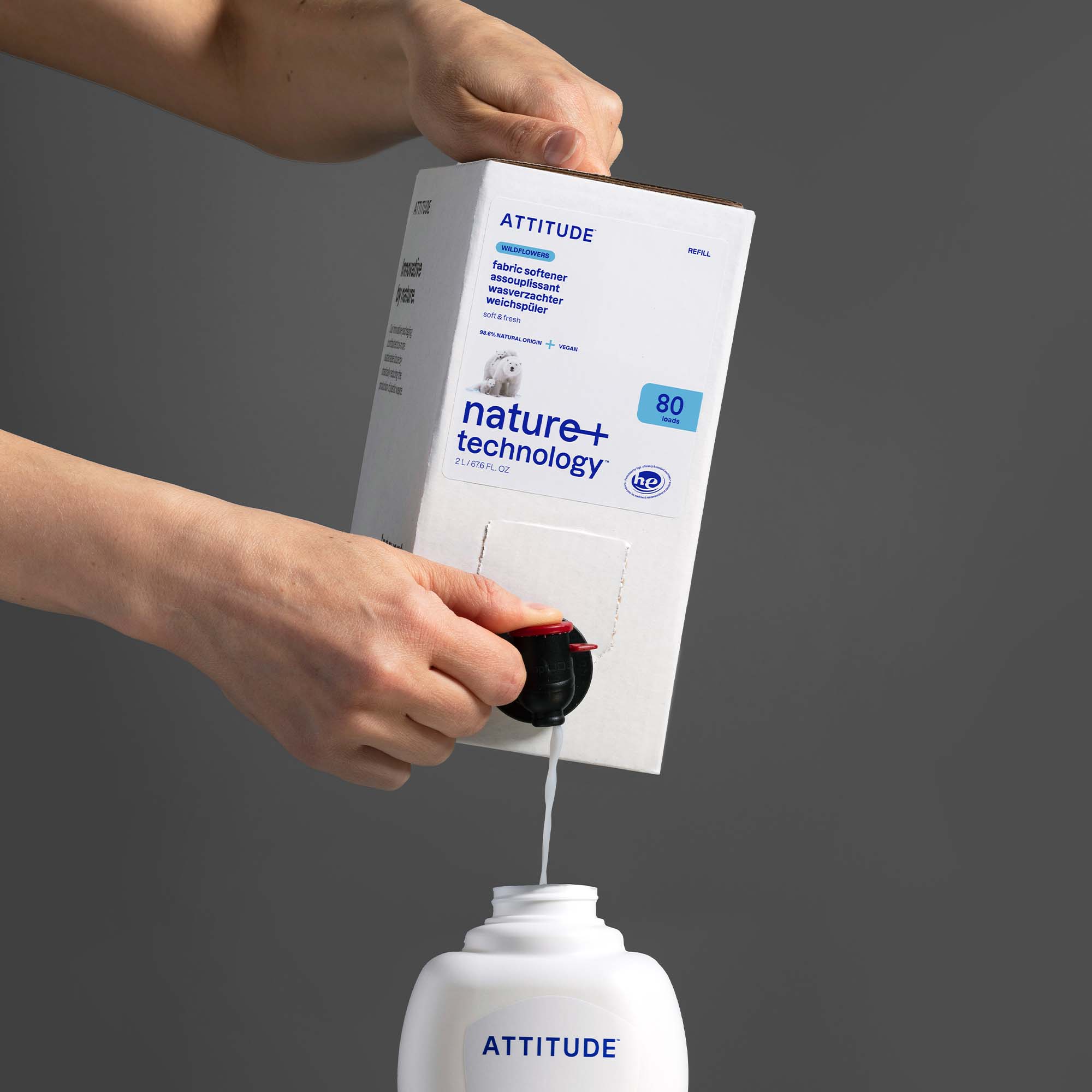 Formulated with 98% naturally derived ingredients, ATTITUDE⢠fabric softener leaves your clothes feeling gentler, fresher and more comfortable. The orange blossom and vanilla perfectly balance the wood aroma, which anchors the fragrance in perfectly sweet and floral notes. Itâs a symphony of scents that leaves your laundry smelling like a bouquet of wildflowers. The bottle is made from HDPE #2 plasticâthe easiest plastic to recycleâand can be reused again and again thanks to our innovative eco-refills. Its vegan formula is offered in a 2 L eco-refill format thatâs easy to carry and use at home. Gentle on both your skin and the planet.