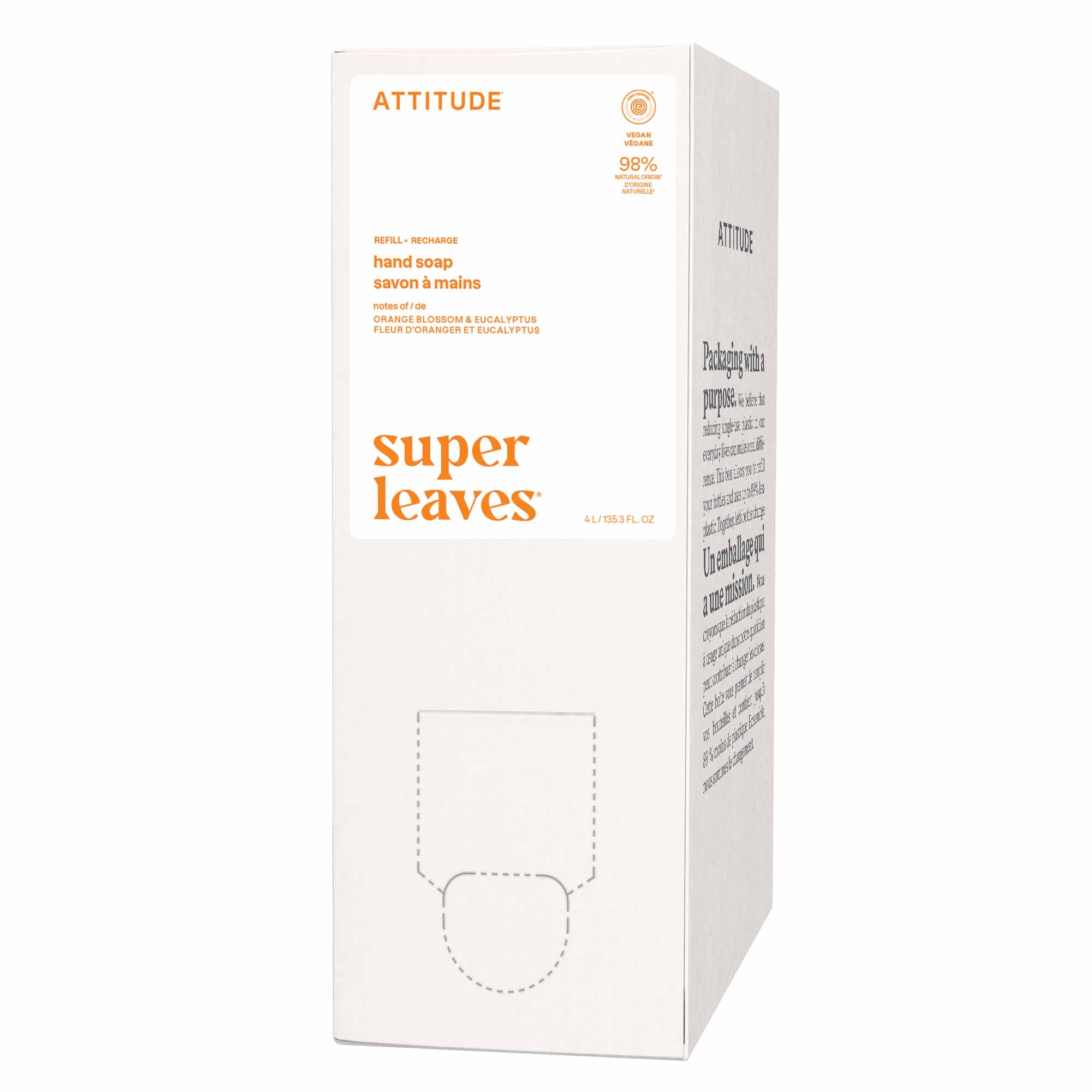 ATTITUDE⢠vegan energizing hand soap gently cleanses your hands. Formulated with 98.9% naturally sourced ingredients* including orange leaves extract to restore skinâs suppleness and improve its appearance. EWG VERIFIED⢠and dermatologically tested, this cleansing soap is enriched with watercress and Indian cress to revitalize skin and keep it healthy. Infused with a floral fragrance with orange blossom and eucalyptus notes, this soap eliminates impurities and makes hand washing a joy. Its eco-refill format is easy to use at home.