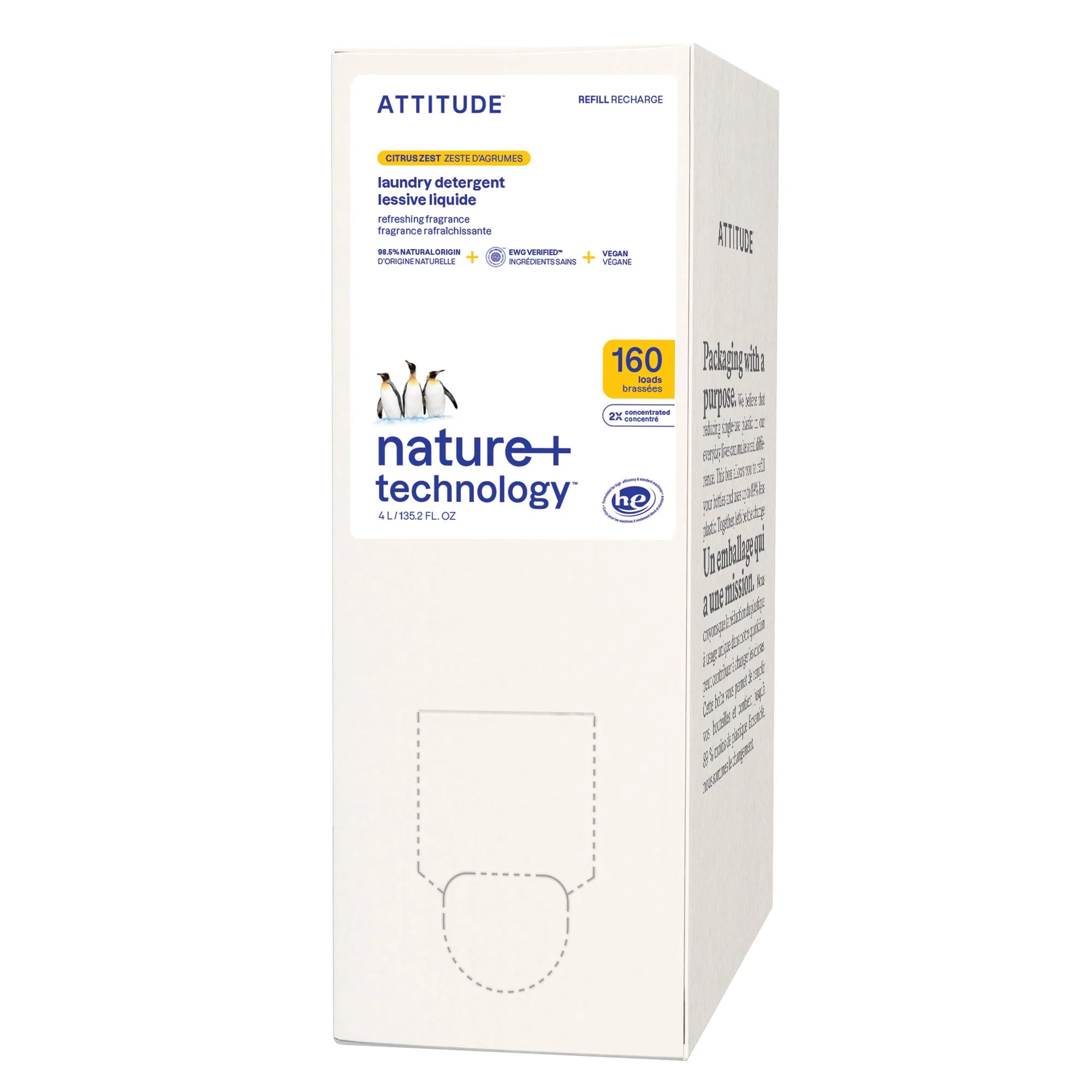 Formulated with 98% naturally derived ingredients, ATTITUDE⢠laundry detergent packs excellent detergent power and is free of enzymes. Its invigorating citrus top notes blend harmoniously with floral and herbaceous lavender. Its concentrated formula allows you to do more loads while using the same amount of detergent. Our laundry detergent is effective for cold water wash, saving you energy. Its vegan formula is certified by PETA and is offered in a 4L eco-refill format thatâs easy to use at home.