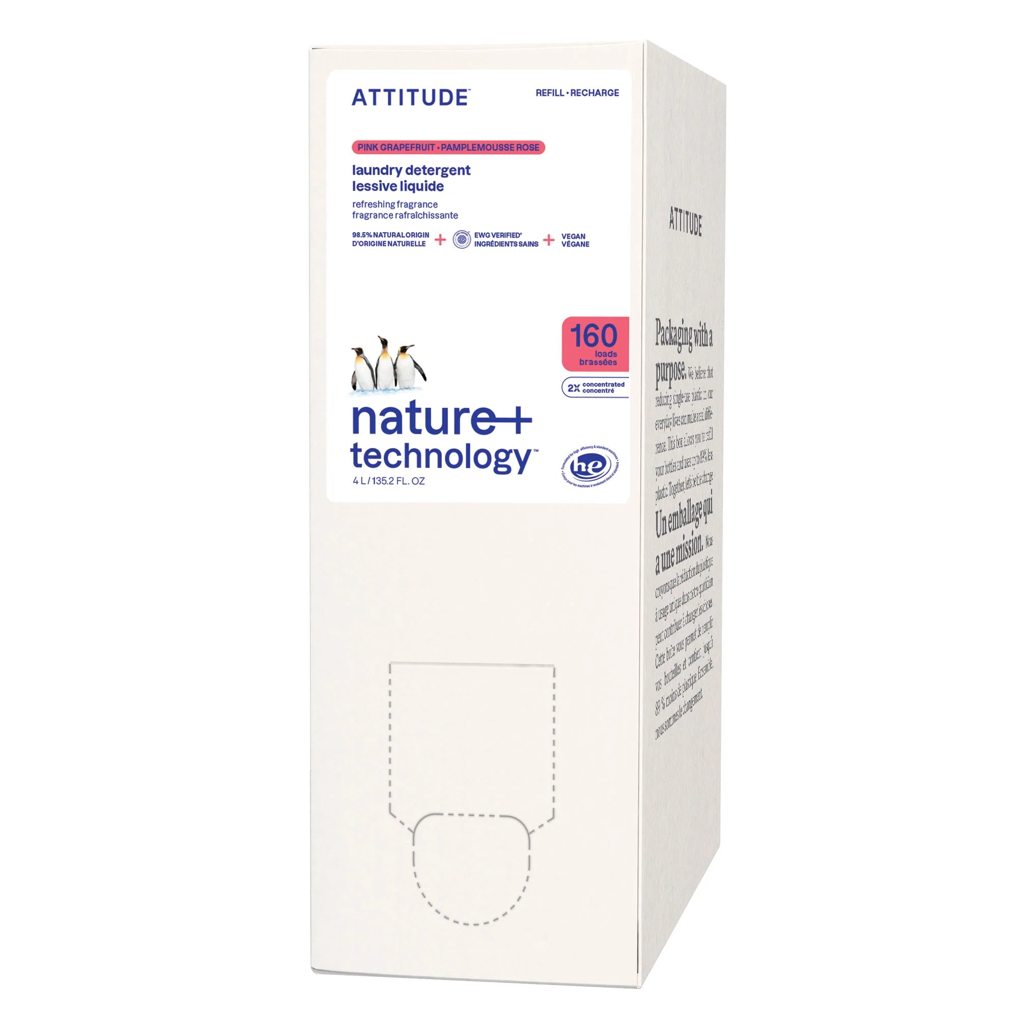 Formulated with 98% naturally derived ingredients, ATTITUDE⢠laundry detergent packs excellent detergent power and is free of enzymes. Its invigorating citrus top notes blend harmoniously with floral and herbaceous lavender. Its concentrated formula allows you to do more loads while using the same amount of detergent. Our laundry detergent is effective for cold water wash, saving you energy. Its vegan formula is certified by PETA and is offered in a 4L eco-refill format thatâs easy to use at home.