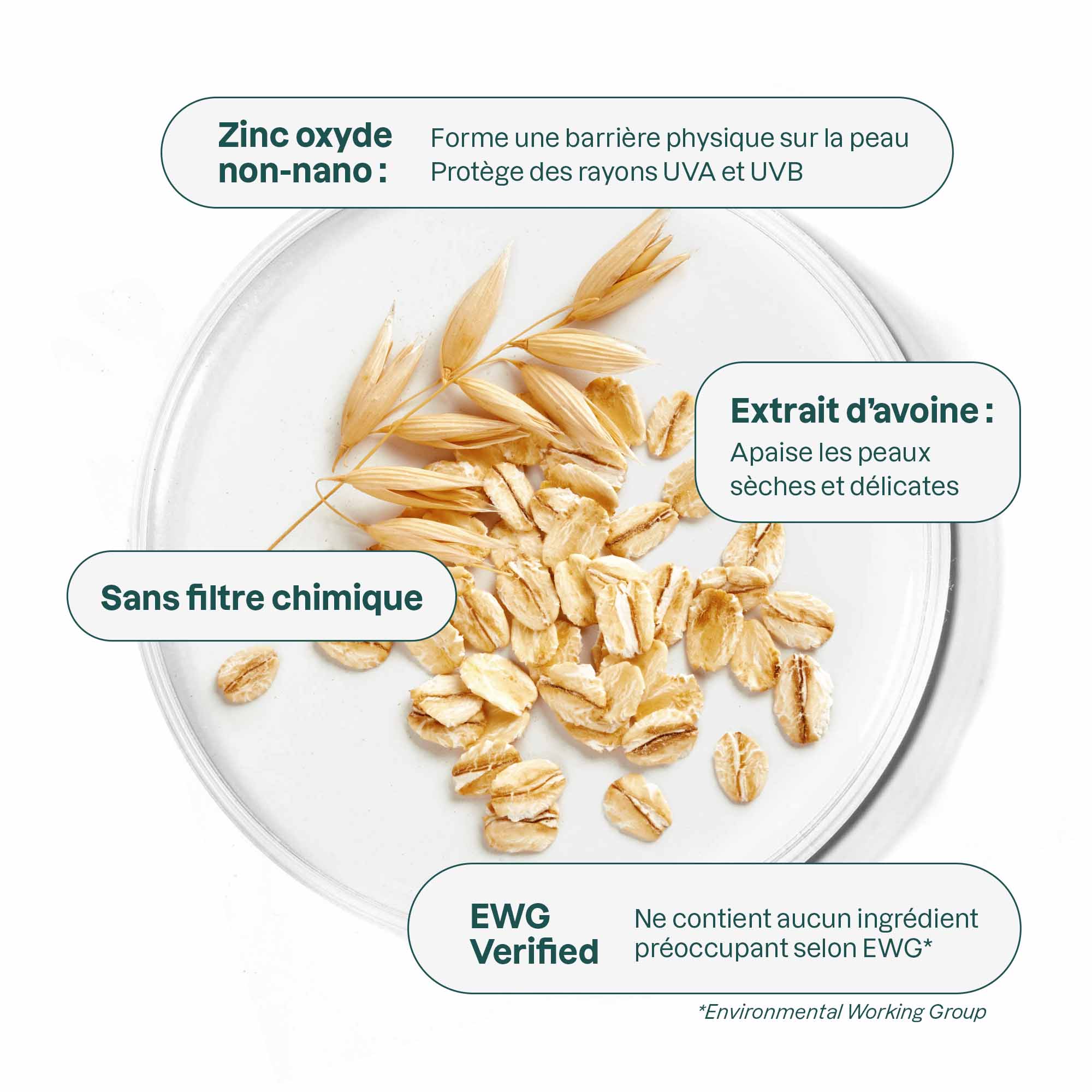 Active ingredient / Ingrédient actif : Zinc oxide (20 %)Inactive ingredient / Ingrédient inactif : Aqua / Water / Eau, Caprylic/Capric Triglyceride, Cetearyl Glucoside, Glyceryl Stearate, Cetearyl Alcohol, Polyhydroxystearic Acid, Avena Sativa (Oat) Kernel Flour (gluten), C10-18 Triglycerides, Glycerin (soybeans/soja), Ethylhexylglycerin, Caprylyl Glycol, Behenyl Alcohol, Sodium Chloride, Xanthan Gum, Sodium Gluconate.